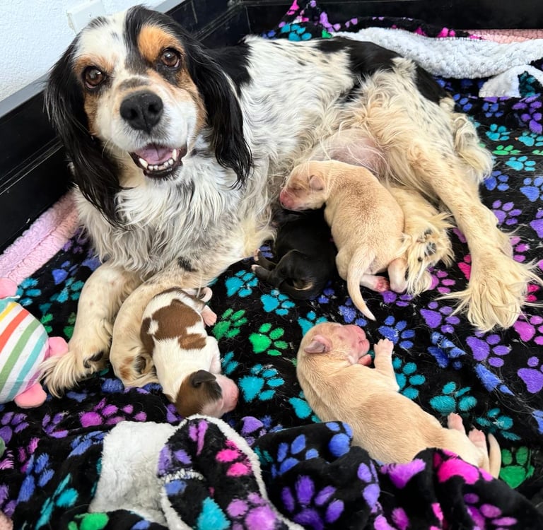 I've dedicated my donated time to communicating with a non-profit organization, Camp Cocker Rescue. Pregnant Betty was one of their rescued dogs, found by a Good Samaritan while she was roaming the streets for a week. When I connected with Betty, she told me how nervous she was, not knowing where she was going or what would happen to her. I wrapped her in my pink bubble to assure her she was in a safe place and that the rescue volunteers would ensure a safe delivery for her babies.