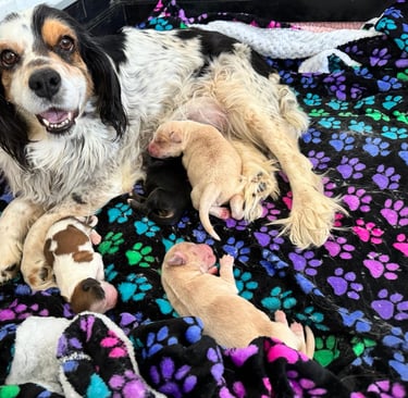 I've dedicated my donated time to communicating with a non-profit organization, Camp Cocker Rescue. Pregnant Betty was one of their rescued dogs, found by a Good Samaritan while she was roaming the streets for a week. When I connected with Betty, she told me how nervous she was, not knowing where she was going or what would happen to her. I wrapped her in my pink bubble to assure her she was in a safe place and that the rescue volunteers would ensure a safe delivery for her babies.